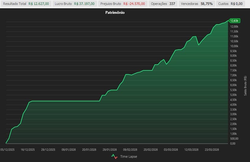 Operações ao vivo na Sala B3 com média de 4 contratos de Índice e Dólar. Estes são os números reais dos últimos meses.
